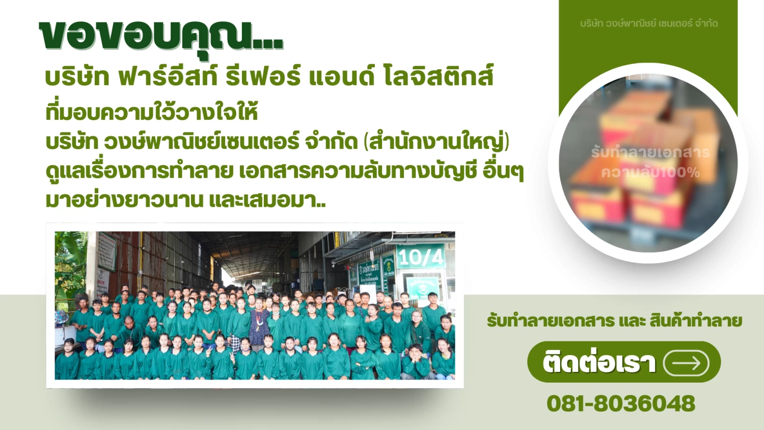 ☢️ บริการรับทำลายเอกสารความลับ และ สินค้าลิขสิทธิ์และสินค้าเสื่อมสภาพ ♻️ บริษัท วงษ์พาณิชย์ เซนเตอร์ จำกัด เป็นผู้ดำเนินการรับทำลายเอกสารทำลาย ความลับ100% ให้กับ บริษัท ฟาร์อีสท์ รีเฟอร์ แอนด์ โลจิสติกส์ จำกัด (FAREAST REEFER & LOGISTICS INC.) 🙏🏻ขอขอบคุณ ที่มอบความใว้วางใจให้ บริษัท วงษ์พาณิชย์เซนเตอร์ จำกัด (สำนักงานใหญ่) ดูแลเรื่องการทำลายสินค้าลิขสิทธิ์และเสื่อมสภาพ มาอย่างยาวนาน และเสมอมา..