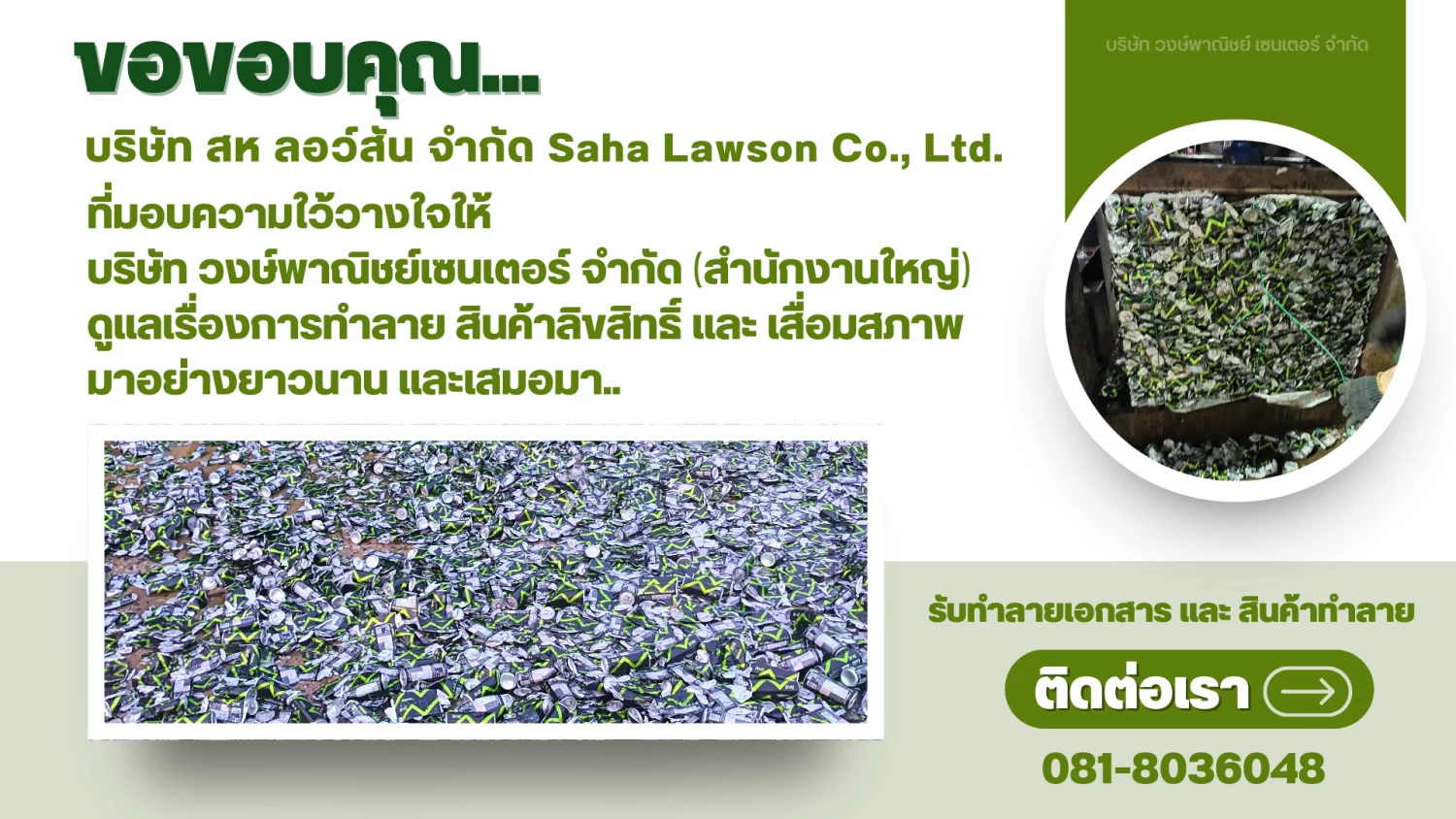 ☢️ บริการรับทำลายเอกสารความลับ และ สินค้าลิขสิทธิ์และสินค้าเสื่อมสภาพ ♻️ บริษัท วงษ์พาณิชย์ เซนเตอร์ จำกัด เป็นผู้ดำเนินการรับทำลายสินค้าลิขสิทธิ์และสินค้าเสื่อมสภาพ ให้กับ Panasonic บริษัท สห ลอว์สัน จำกัด Saha Lawson Co., Ltd. ประจำปี 2568 🙏🏻ขอขอบคุณ ที่มอบความใว้วางใจให้ บริษัท วงษ์พาณิชย์เซนเตอร์ จำกัด (สำนักงานใหญ่) ดูแลเรื่องการทำลายสินค้าลิขสิทธิ์และเสื่อมสภาพ มาอย่างยาวนาน และเสมอมา..