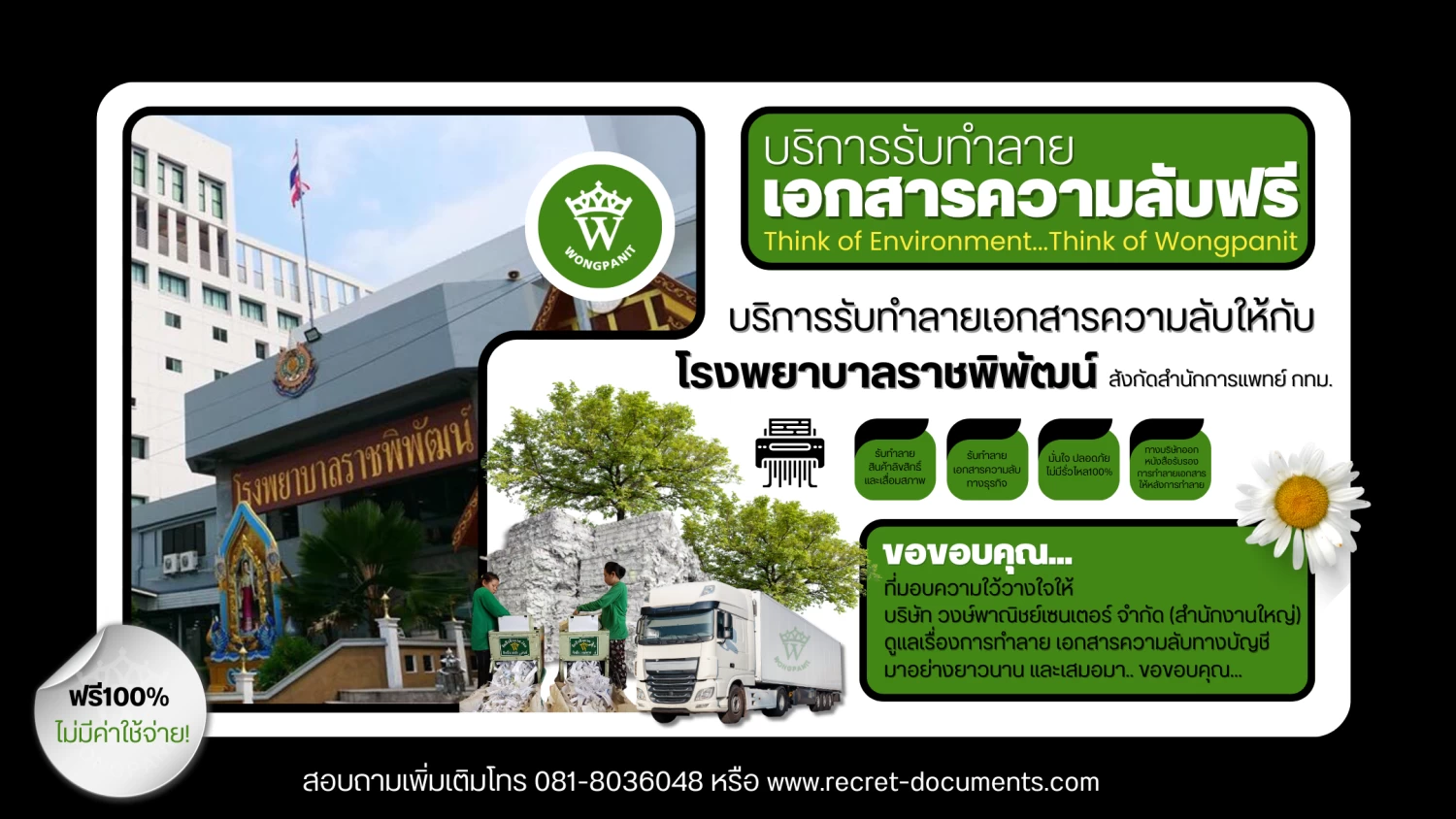 ☢️ บริการรับทำลายเอกสารความลับ และ สินค้าลิขสิทธิ์และสินค้าเสื่อมสภาพ ฟรี!♻️ บริษัท วงษ์พาณิชย์ เซนเตอร์ จำกัด เป็นผู้ดำเนินการรับทำลายเอกสารความลับ ให้กับ... โรงพยาบาลราชพิพัฒน์ เป็นโรงพยาบาล สังกัดสำนักการแพทย์ กรุงเทพมหานคร ประจำปี 2569 🙏🏻ขอขอบคุณ ที่มอบความใว้วางใจให้ บริษัท วงษ์พาณิชย์เซนเตอร์ จำกัด (สำนักงานใหญ่) ดูแลเรื่องการทำลายสินค้าลิขสิทธิ์และเสื่อมสภาพ มาอย่างยาวนาน และเสมอมา..