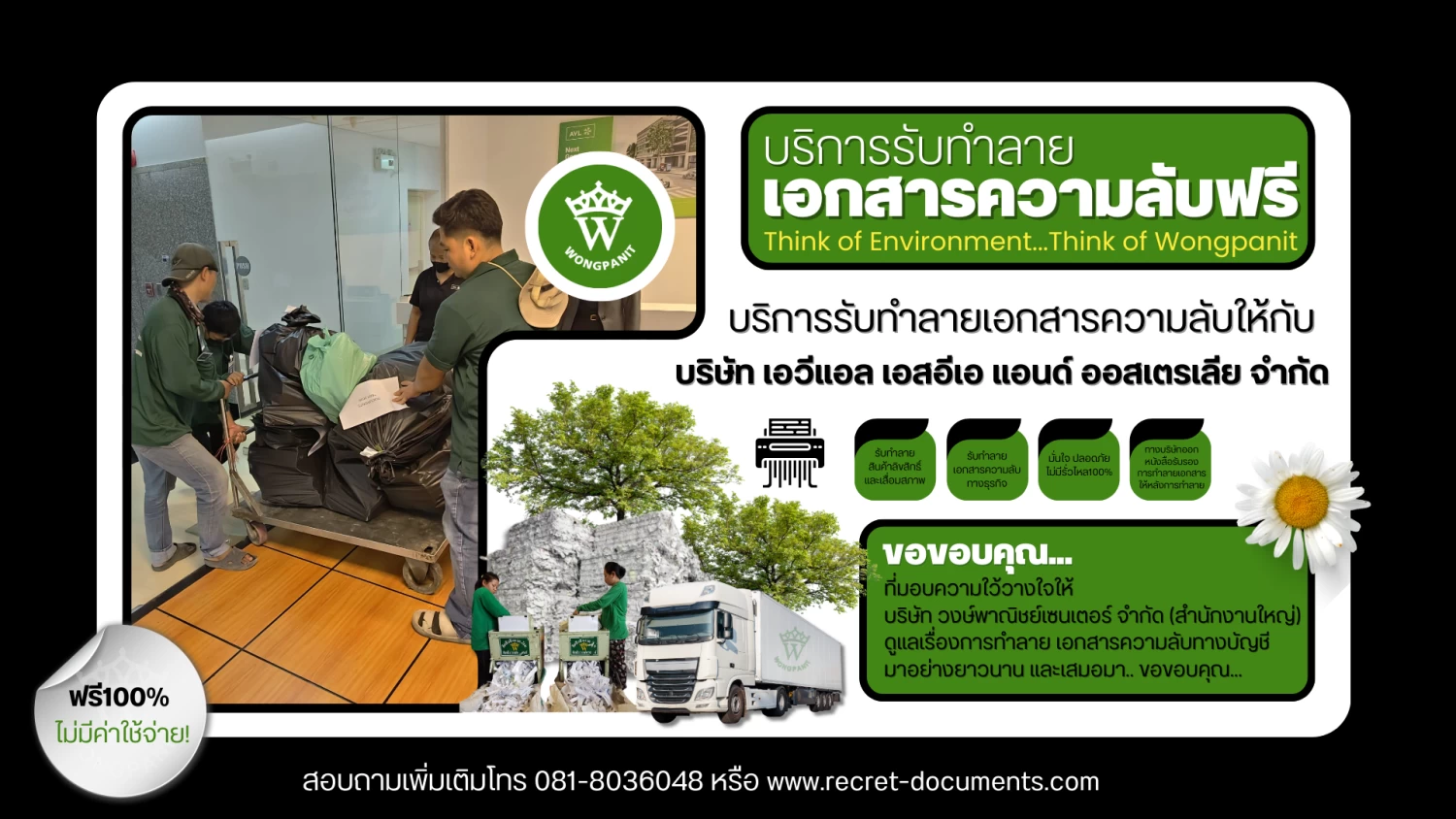 ☢️ บริการรับทำลายเอกสารความลับ และ สินค้าลิขสิทธิ์และสินค้าเสื่อมสภาพ ฟรี!♻️ บริษัท วงษ์พาณิชย์ เซนเตอร์ จำกัด เป็นผู้ดำเนินการรับทำลายเอกสารความลับ ให้กับ...บริษัท เอวีแอล เอสอีเอ แอนด์ ออสเตรเลีย จำกัด ประจำปี 2569 🙏🏻ขอขอบคุณ ที่มอบความใว้วางใจให้ บริษัท วงษ์พาณิชย์เซนเตอร์ จำกัด (สำนักงานใหญ่) ดูแลเรื่องการทำลายสินค้าลิขสิทธิ์และเสื่อมสภาพ มาอย่างยาวนาน และเสมอมา..
