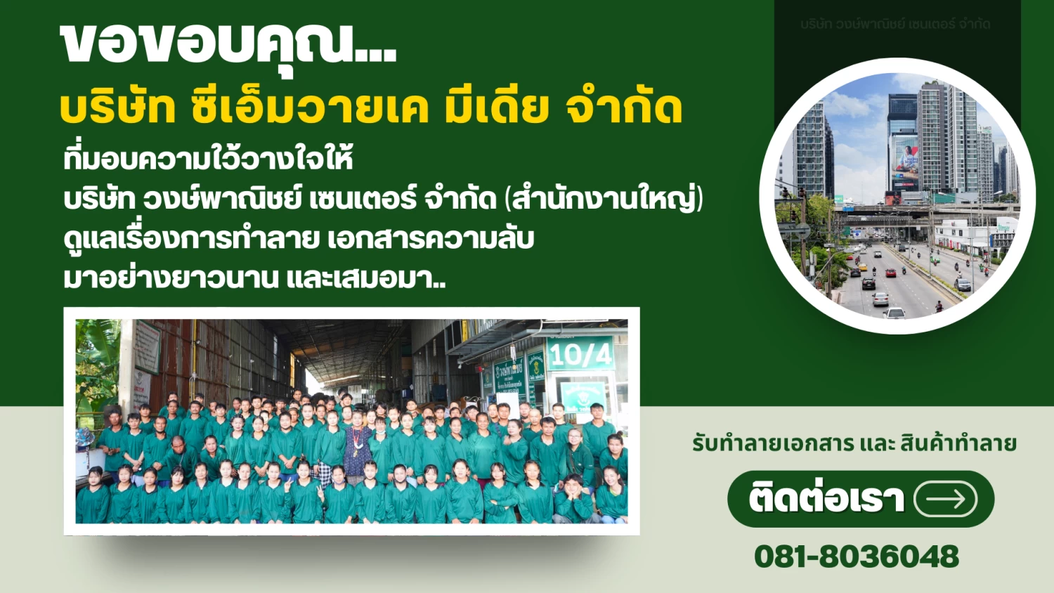 ☢️ บริการรับทำลายเอกสารความลับ และ สินค้าลิขสิทธิ์และสินค้าเสื่อมสภาพ ♻️ บริษัท วงษ์พาณิชย์ เซนเตอร์ จำกัด เป็นผู้ดำเนินการรับทำลายเอกสารความลับบัญชี ให้กับ บริษัท ซีเอ็มวายเค มีเดีย จํากัด 🙏🏻 ขอขอบคุณ ที่มอบความใว้วางใจให้ บริษัท วงษ์พาณิชย์ เซนเตอร์ จำกัด (สำนักงานใหญ่) ดูแลเรื่องการทำลายเอกสารความลับ มาอย่างยาวนาน และเสมอมา..