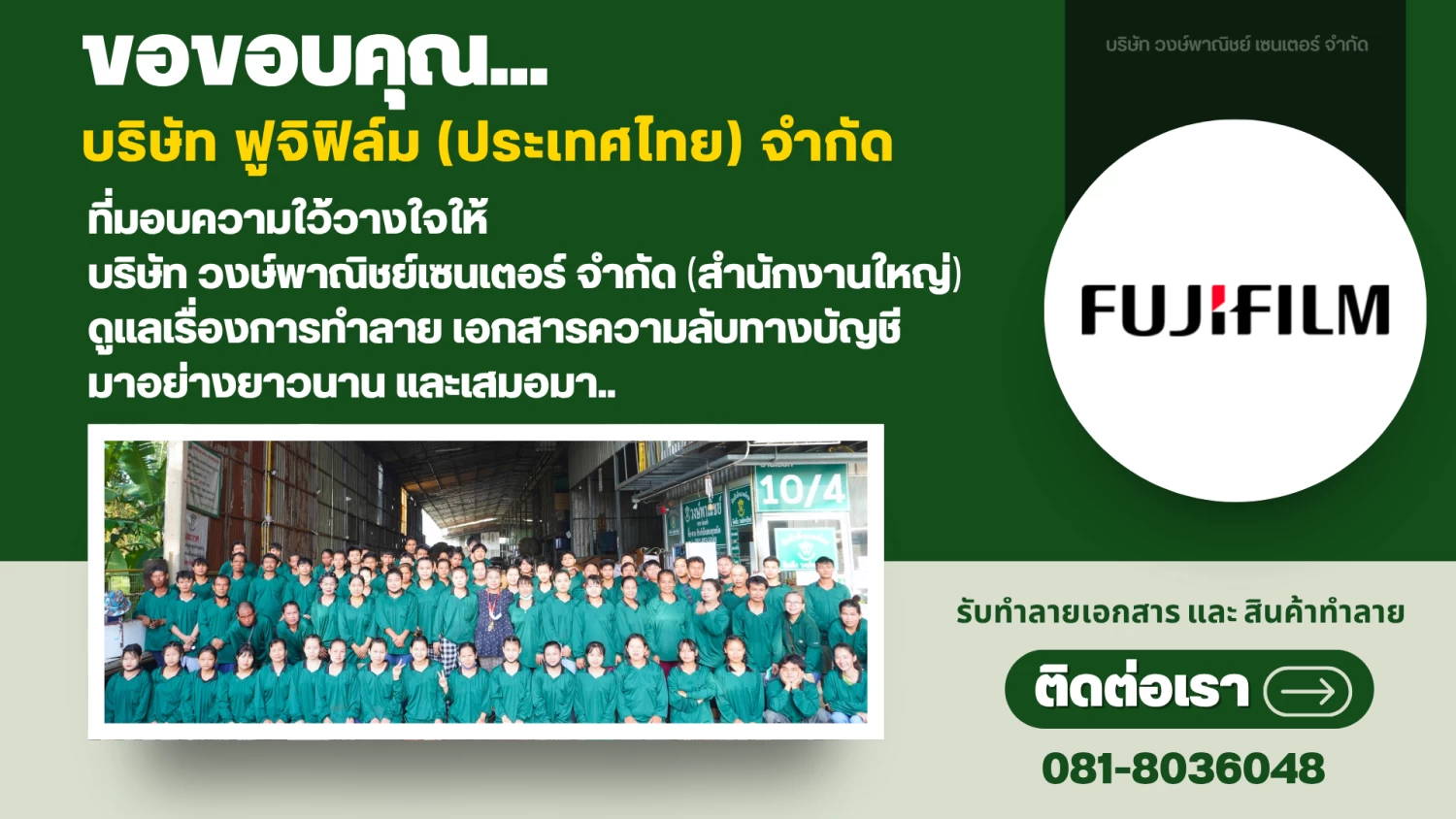 ☢️ บริการรับทำลายเอกสารความลับ และ สินค้าลิขสิทธิ์และสินค้าเสื่อมสภาพ ♻️ บริษัท วงษ์พาณิชย์ เซนเตอร์ จำกัด เป็นผู้ดำเนินการรับทำลายสินค้าลิขสิทธิ์และสินค้าเสื่อมสภาพ ให้กับ FUJIFiLM บริษัท ฟูจิฟิล์ม (ประเทศไทย) จำกัด 🙏🏻ขอขอบคุณ ที่มอบความใว้วางใจให้ บริษัท วงษ์พาณิชย์เซนเตอร์ จำกัด (สำนักงานใหญ่) ดูแลเรื่องการทำลายสินค้าลิขสิทธิ์และเสื่อมสภาพ มาอย่างยาวนาน และเสมอมา..