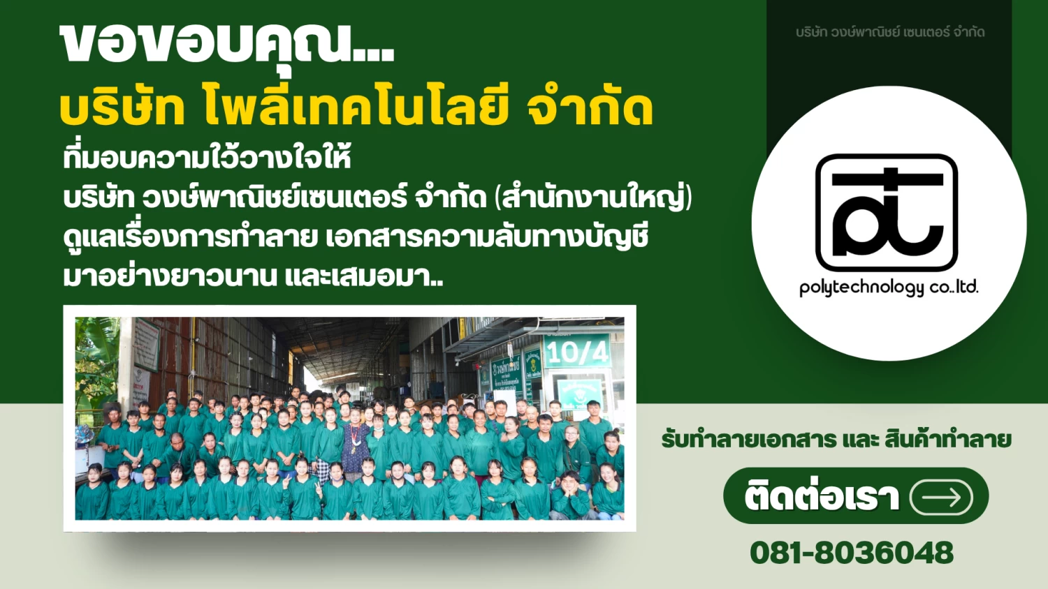 ☢️ บริการรับทำลายเอกสารความลับ และ สินค้าลิขสิทธิ์และสินค้าเสื่อมสภาพ ♻️ บริษัท วงษ์พาณิชย์ เซนเตอร์ จำกัด เป็นผู้ดำเนินการรับทำลายสินค้าลิขสิทธิ์และสินค้าเสื่อมสภาพ ให้กับ โบริษัท โพลีเทคโนโลยี จํากัด 🙏🏻ขอขอบคุณ ที่มอบความใว้วางใจให้ บริษัท วงษ์พาณิชย์เซนเตอร์ จำกัด (สำนักงานใหญ่) ดูแลเรื่องการทำลายสินค้าลิขสิทธิ์และเสื่อมสภาพ มาอย่างยาวนาน และเสมอมา..