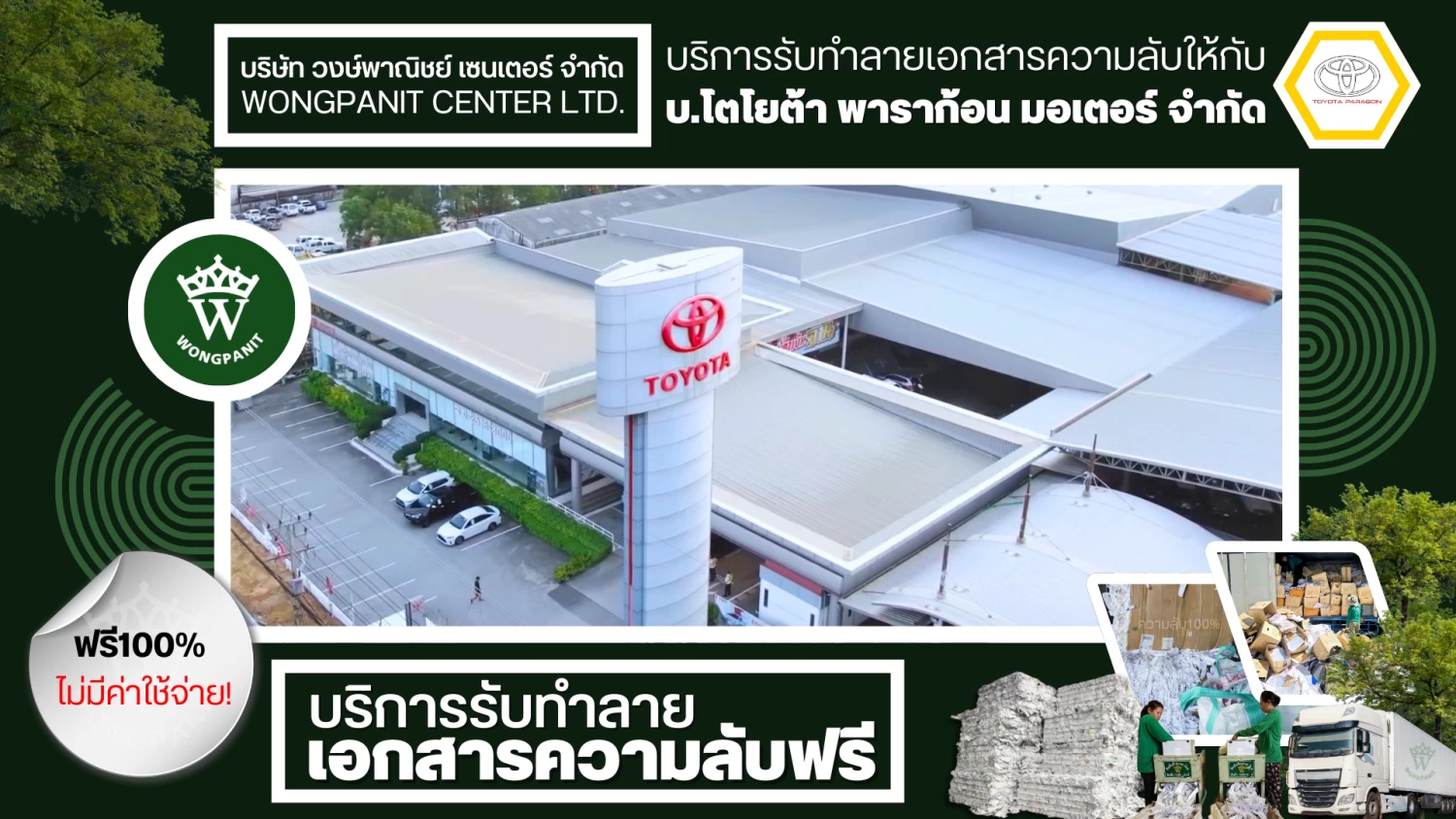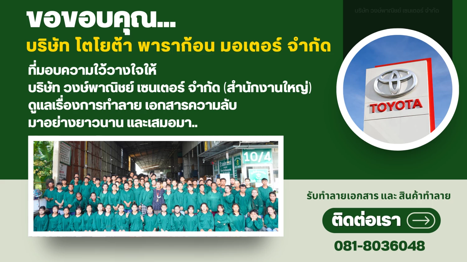 ☢️ บริการรับทำลายเอกสารความลับ และ สินค้าลิขสิทธิ์และสินค้าเสื่อมสภาพ ♻️ บริษัท วงษ์พาณิชย์ เซนเตอร์ จำกัด เป็นผู้ดำเนินการรับทำลายเอกสารความลับบัญชี ให้กับ บริษัท โตโยต้า พาราก้อน มอเตอร์ จํากัด 🙏🏻 ขอขอบคุณ ที่มอบความใว้วางใจให้ บริษัท วงษ์พาณิชย์ เซนเตอร์ จำกัด (สำนักงานใหญ่) ดูแลเรื่องการทำลายเอกสารความลับ มาอย่างยาวนาน และเสมอมา..